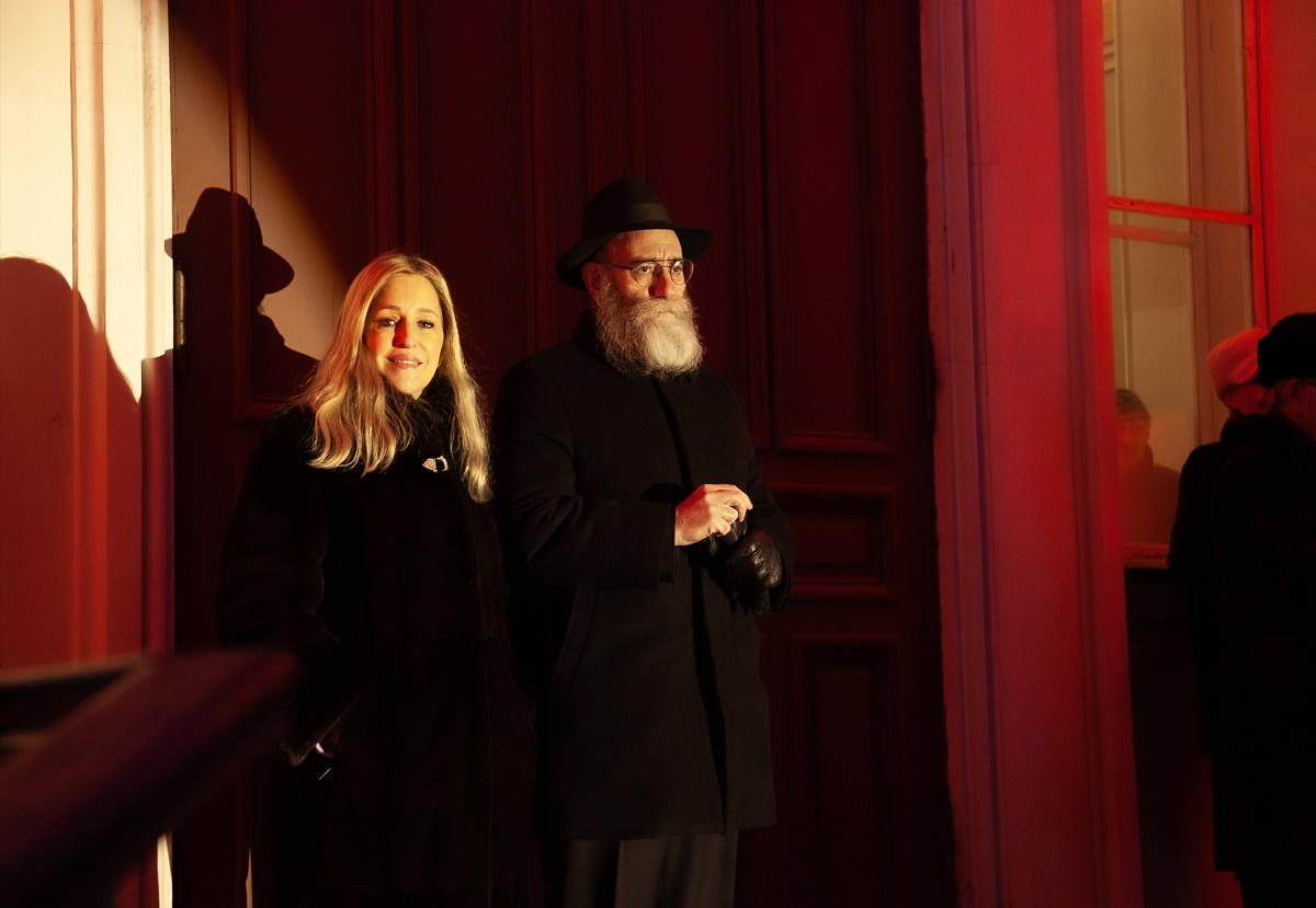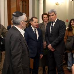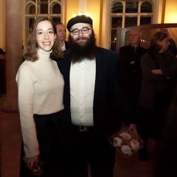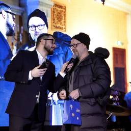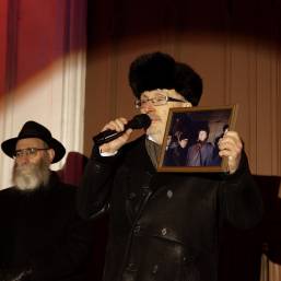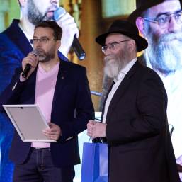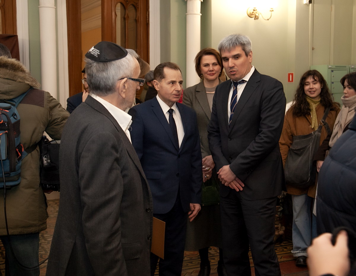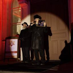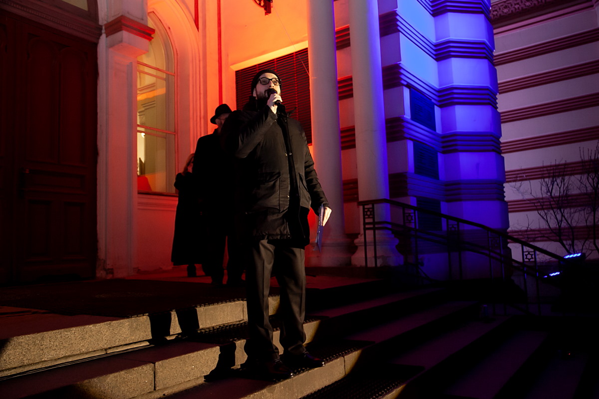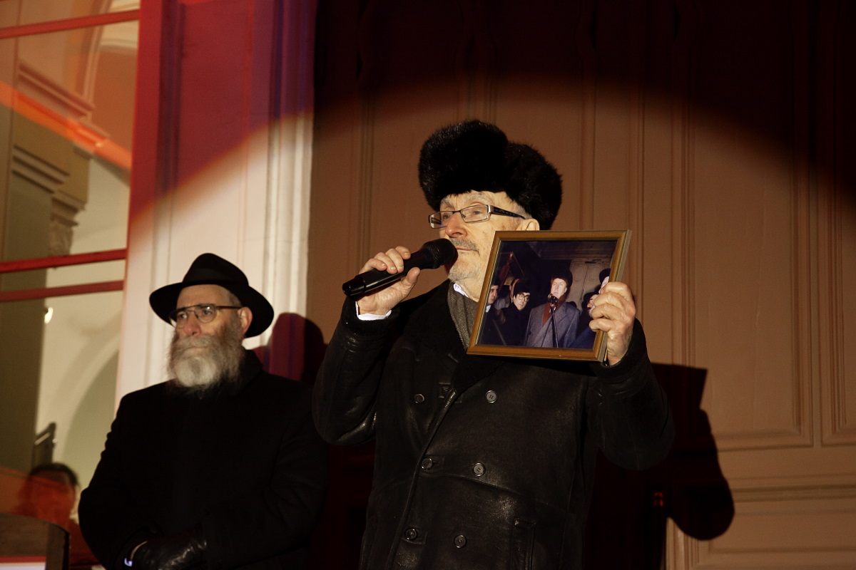 Главный раввин Петербурга М. М. Певзнер и председатель общины М. Д. Грубарг приветствуют собравшихся и поздравляют всех с Ханукой