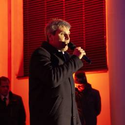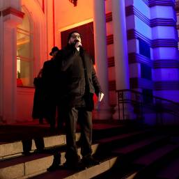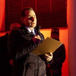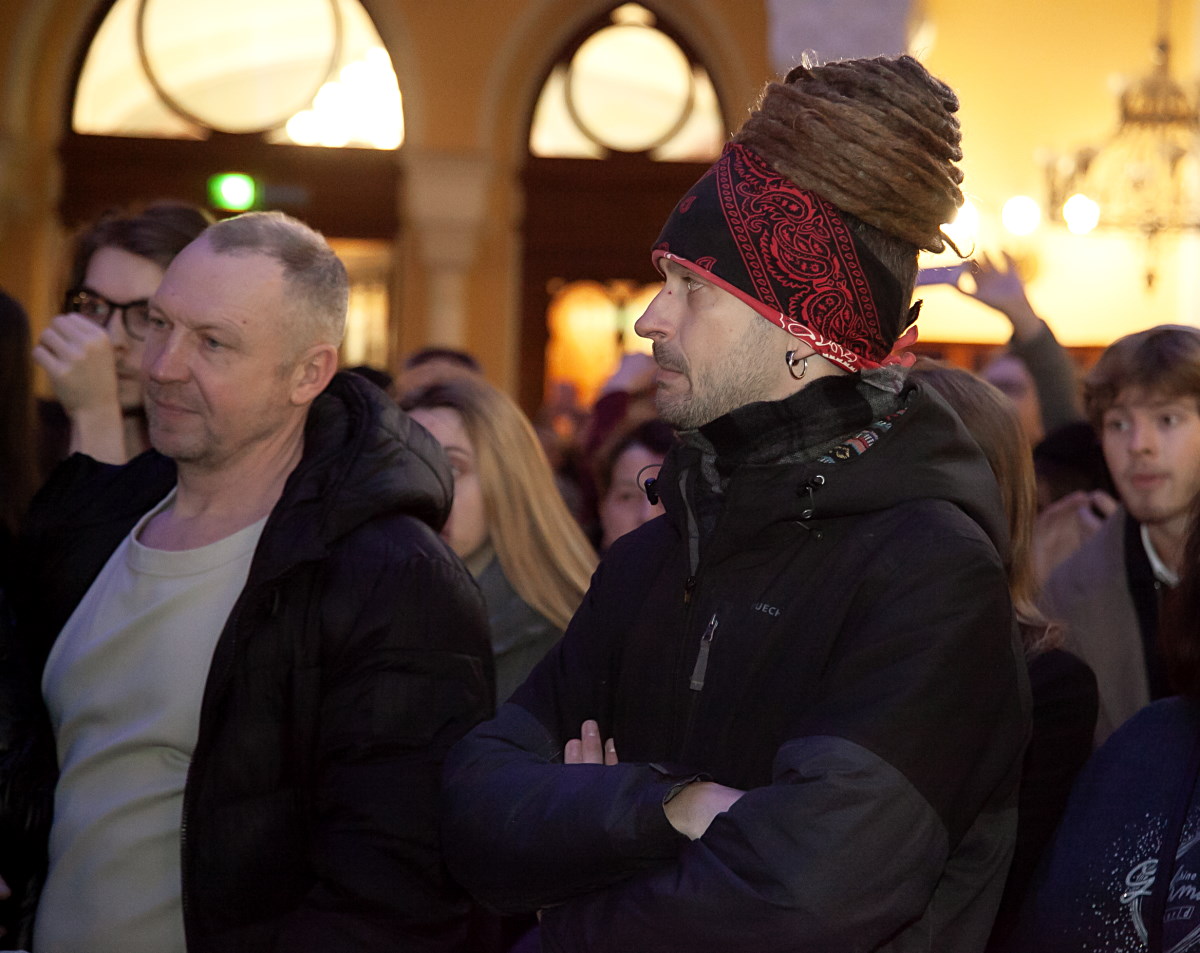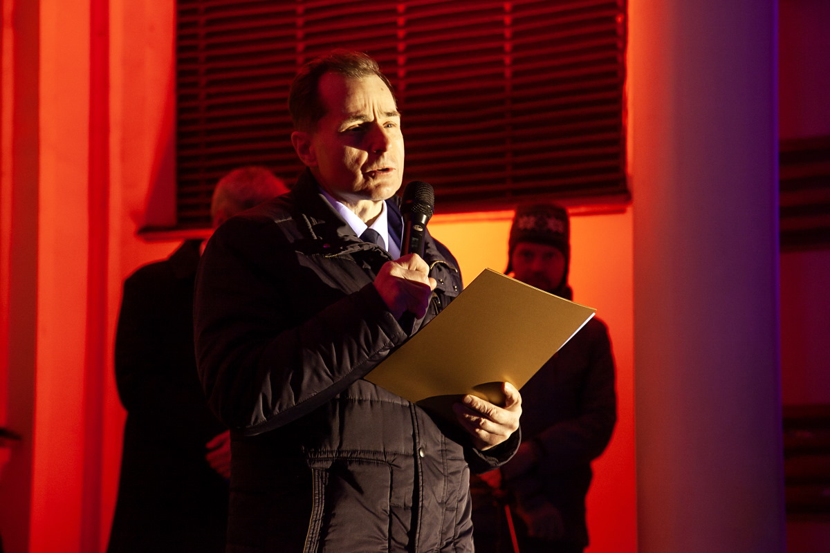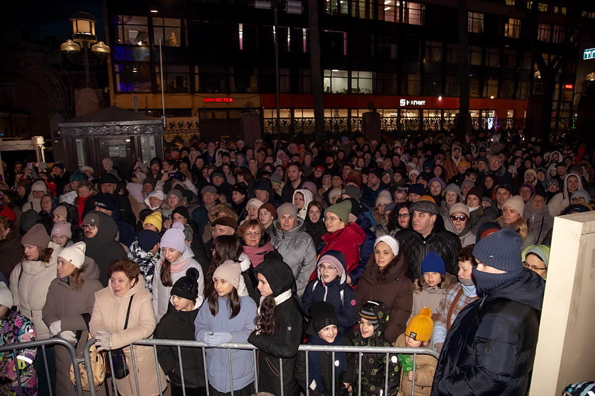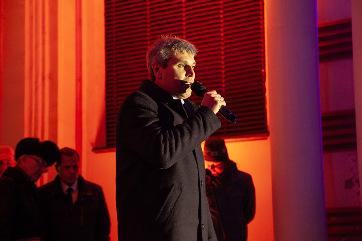 Главный раввин Петербурга М. М. Певзнер и председатель общины М. Д. Грубарг приветствуют собравшихся и поздравляют всех с Ханукой